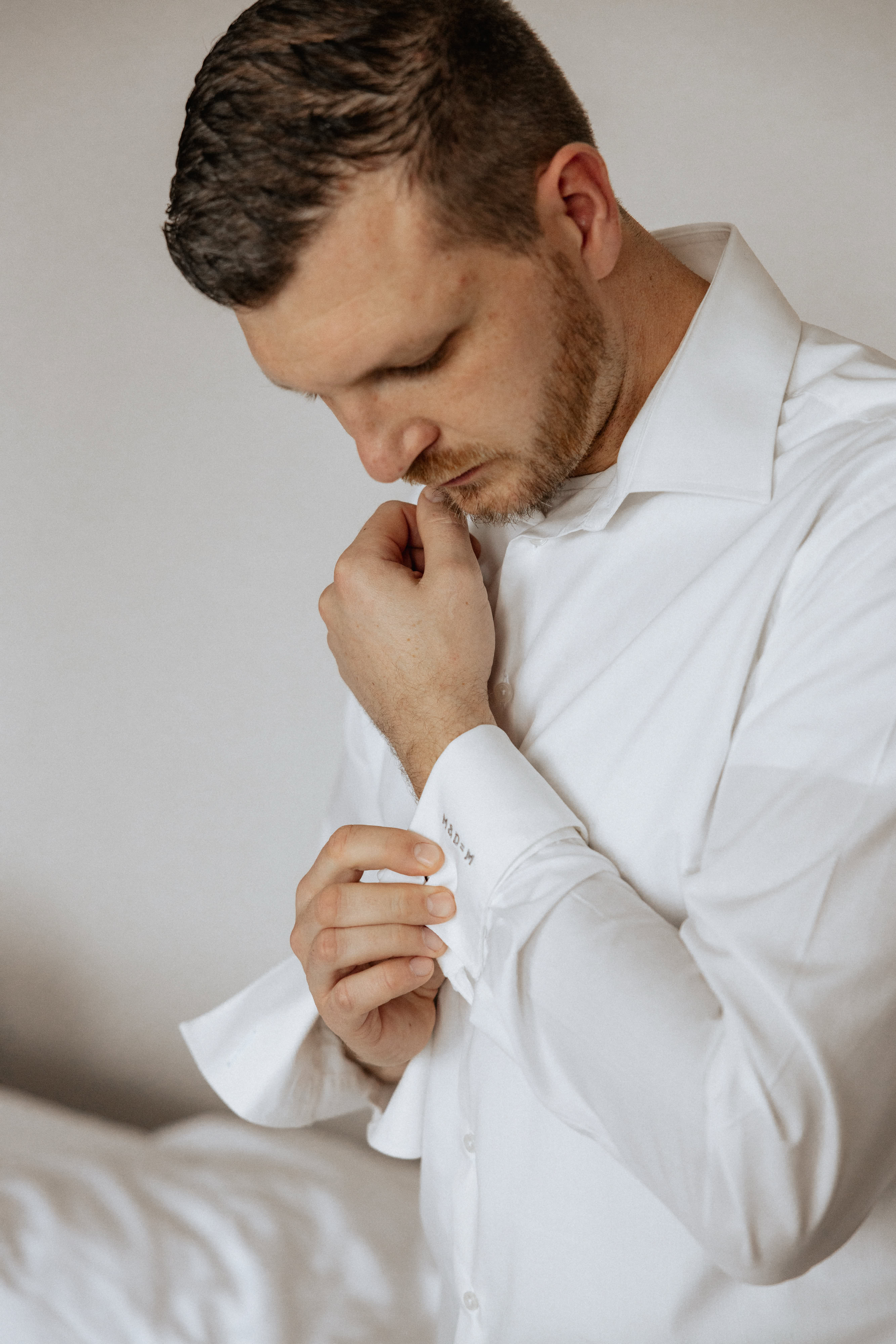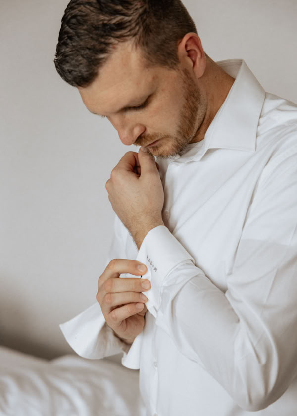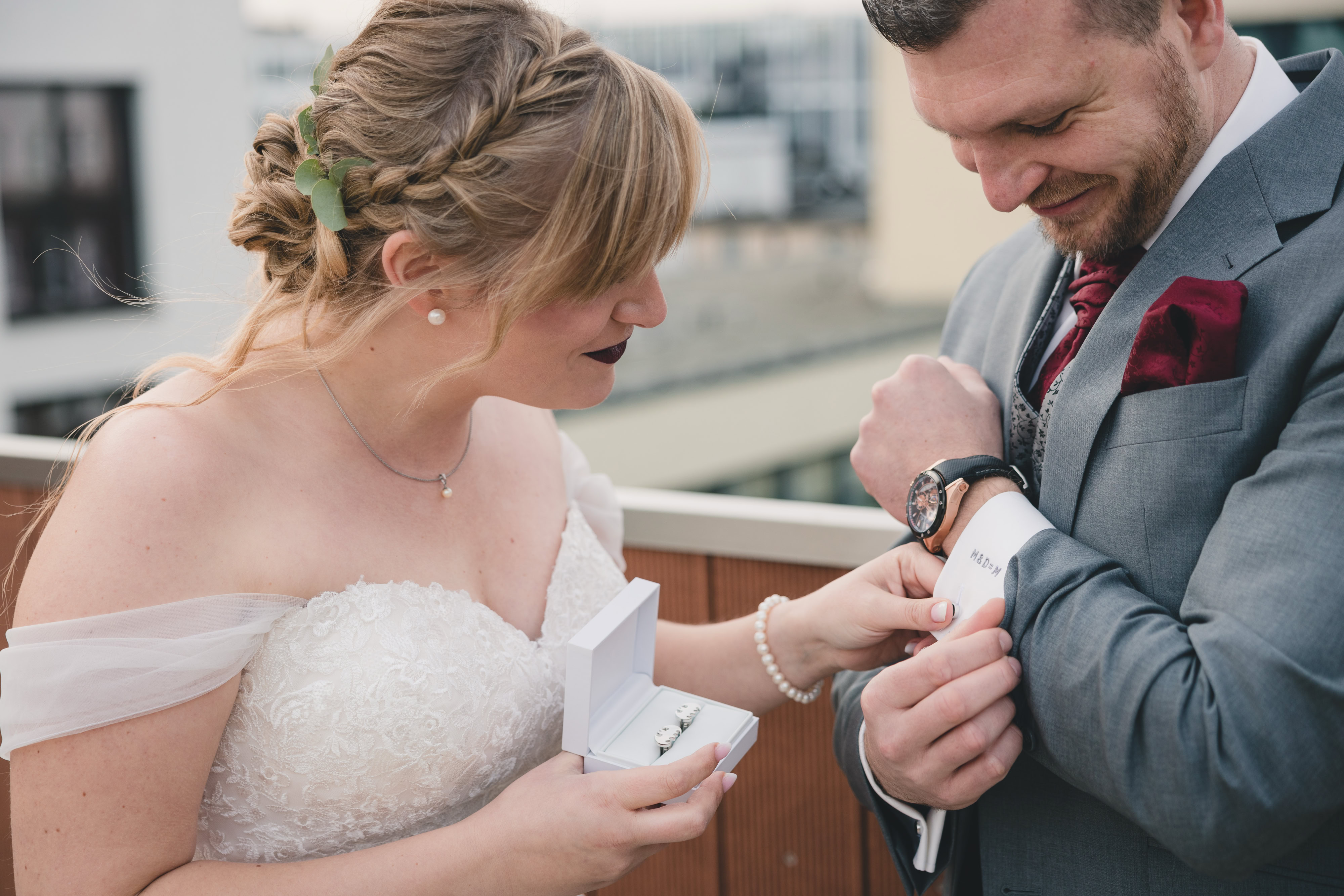 Melanie und Daniel feierten Ihre freie Trauung im Ballsaal des Marriott Hotels in Köln. Vor der freien Trauung durfte ich beide beim Getting Ready begleiten. Trotzdessen, dass beide sich bereits das offizielle Ja-Wort gegeben hatten, bemerkte ich vor allem bei Daniel die Aufregung während er sich fertig machte. Selbst an das kleinste Detail hat er bei seinem Dresscode gedacht: Im Ärmel waren die Initialen seiner Frau wie auch seiner Tochter eingestickt.