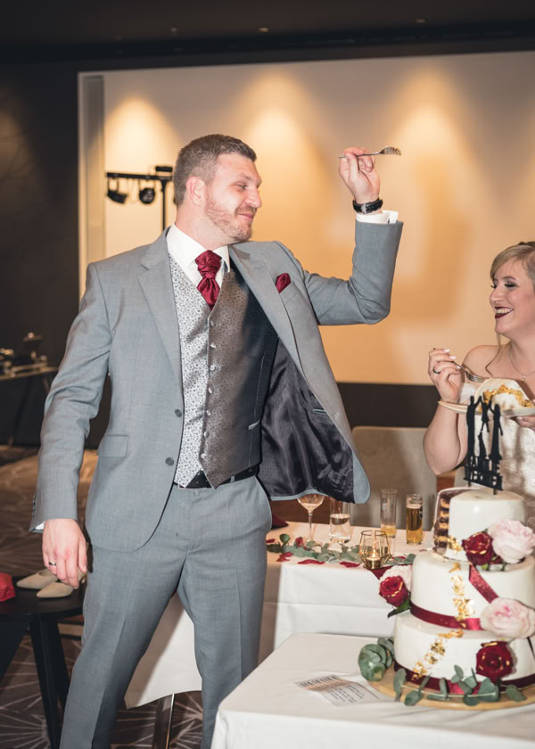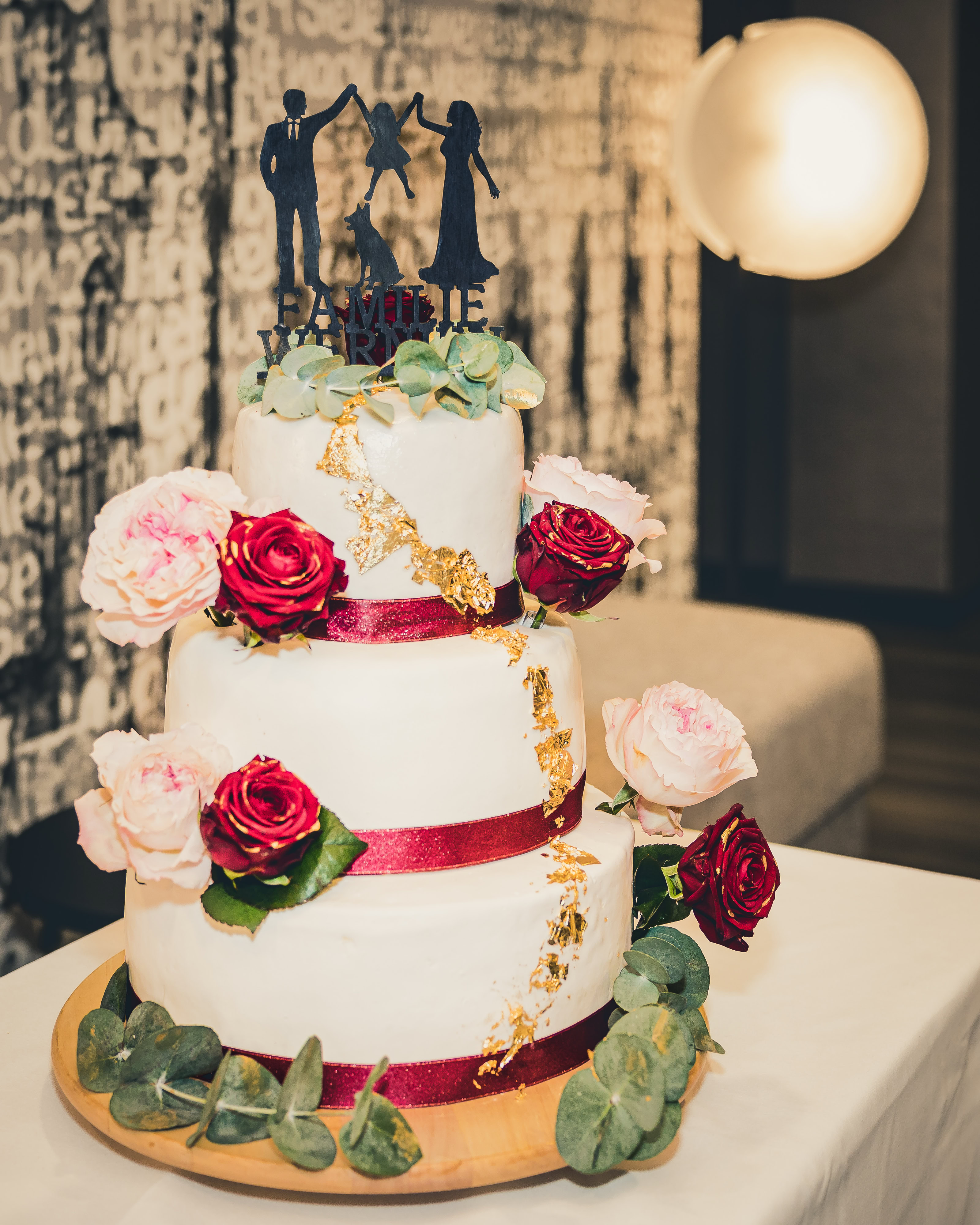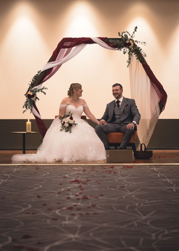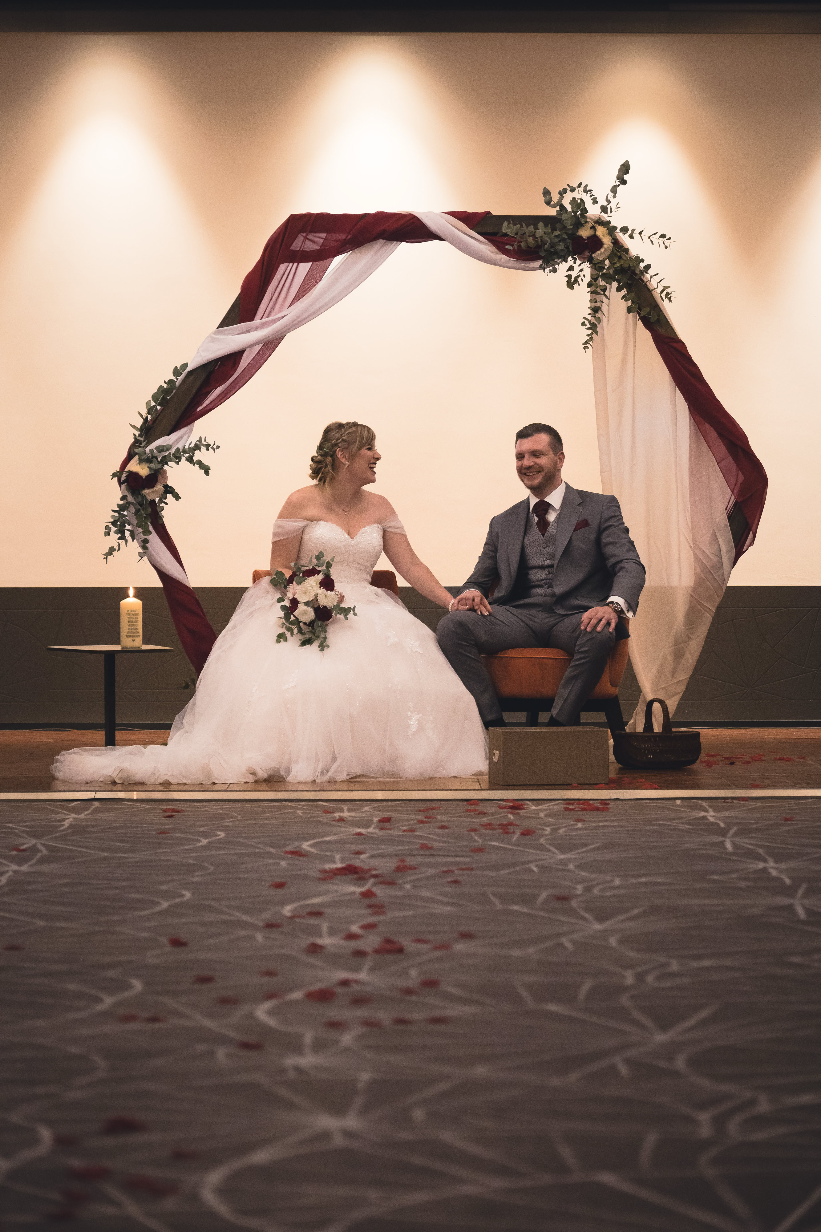 Unten im Ballsaal trudelten allmählich die Gäste ein und haben die Zeit bis zur Zeremonie mit kölschen Köstlichkeiten überbrückt. Melanie wurde schließlich von ihrer Mutter durch den Saal zu ihrem Daniel geführt und beide gaben sich erneut symbolisch das Ja-Wort.