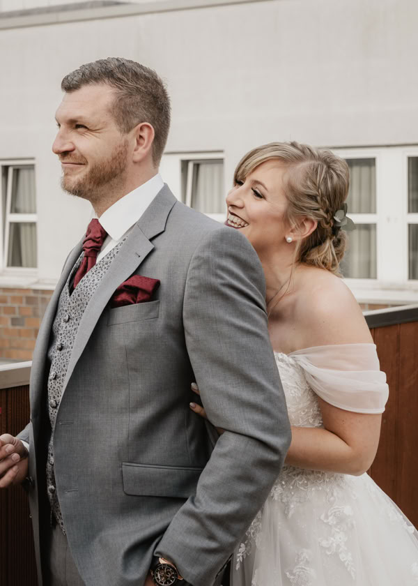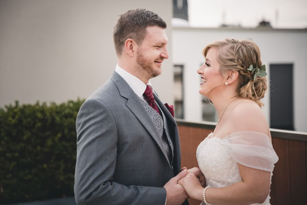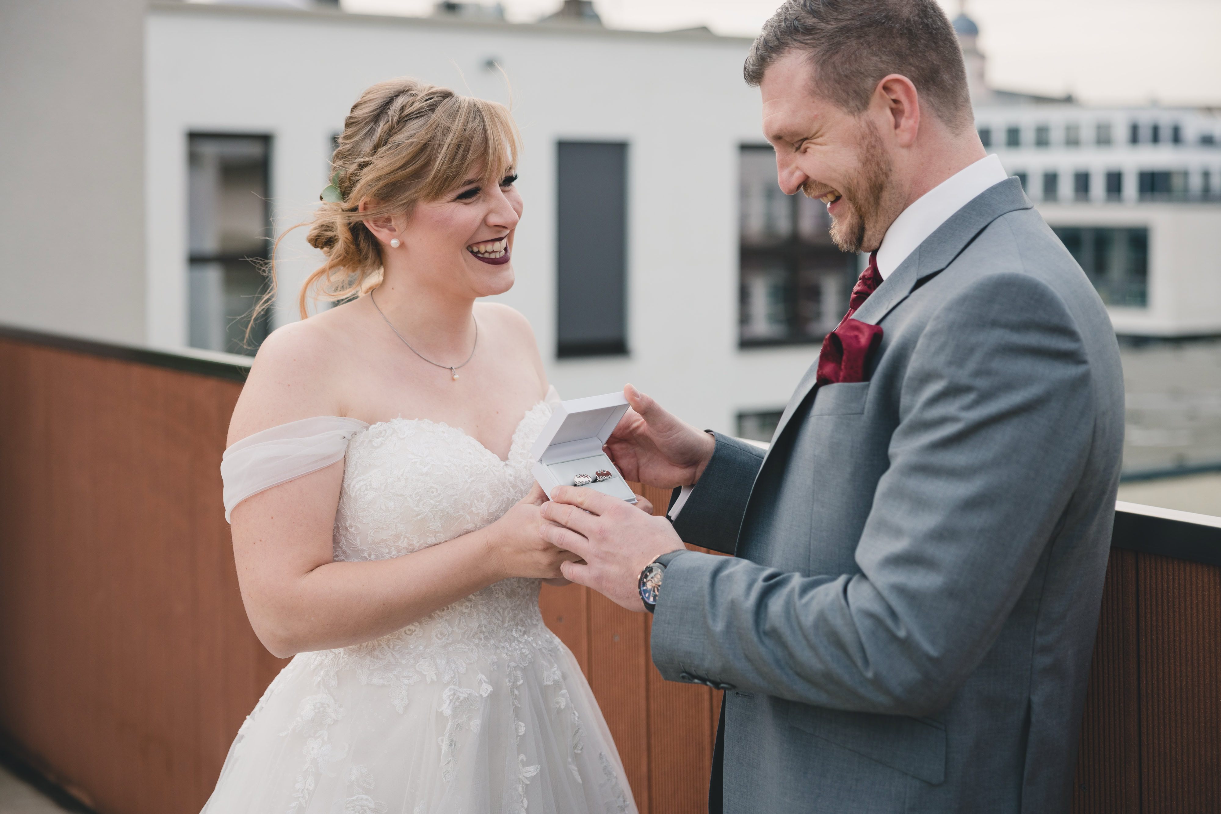Daniel wartete gespannt auf der Dachterrasse. Und dann kam der magische Augenblick des First Looks - auch für mich immer wieder ein Gänsehaut-Moment. Der erste Blick des Brautpaares zueinander, das Funkeln in den Augen und letztlich auch die gefühlvollen Gesten machen diesen einen Augenblick zu einer der tollsten Erinnerungen einer Hochzeitsreportage.