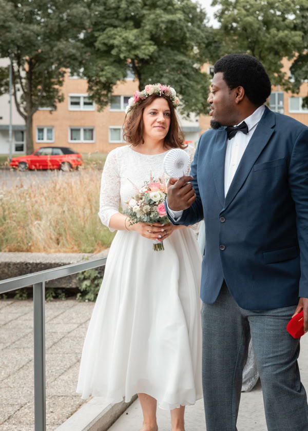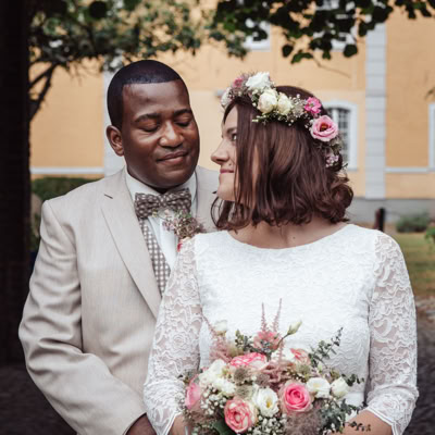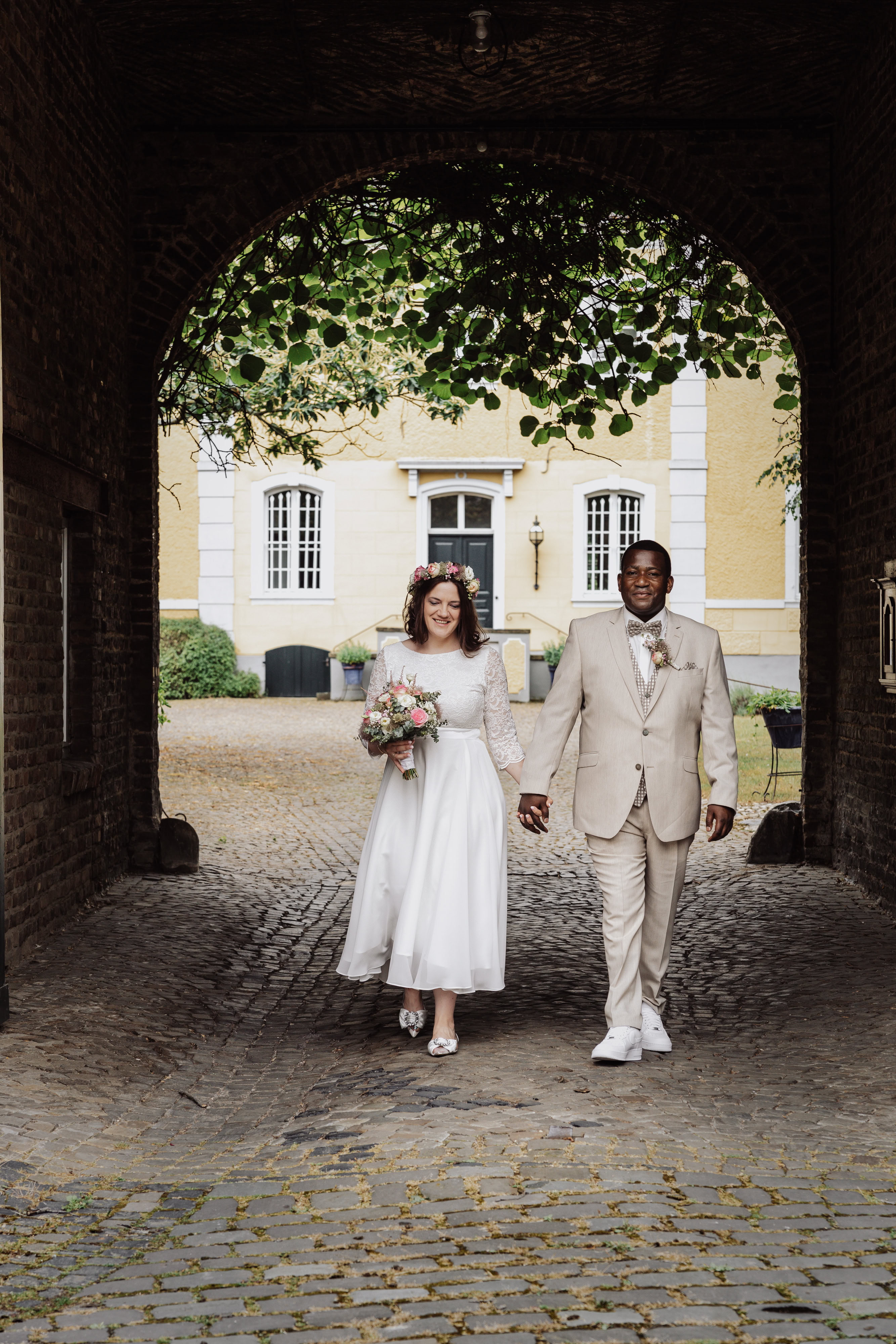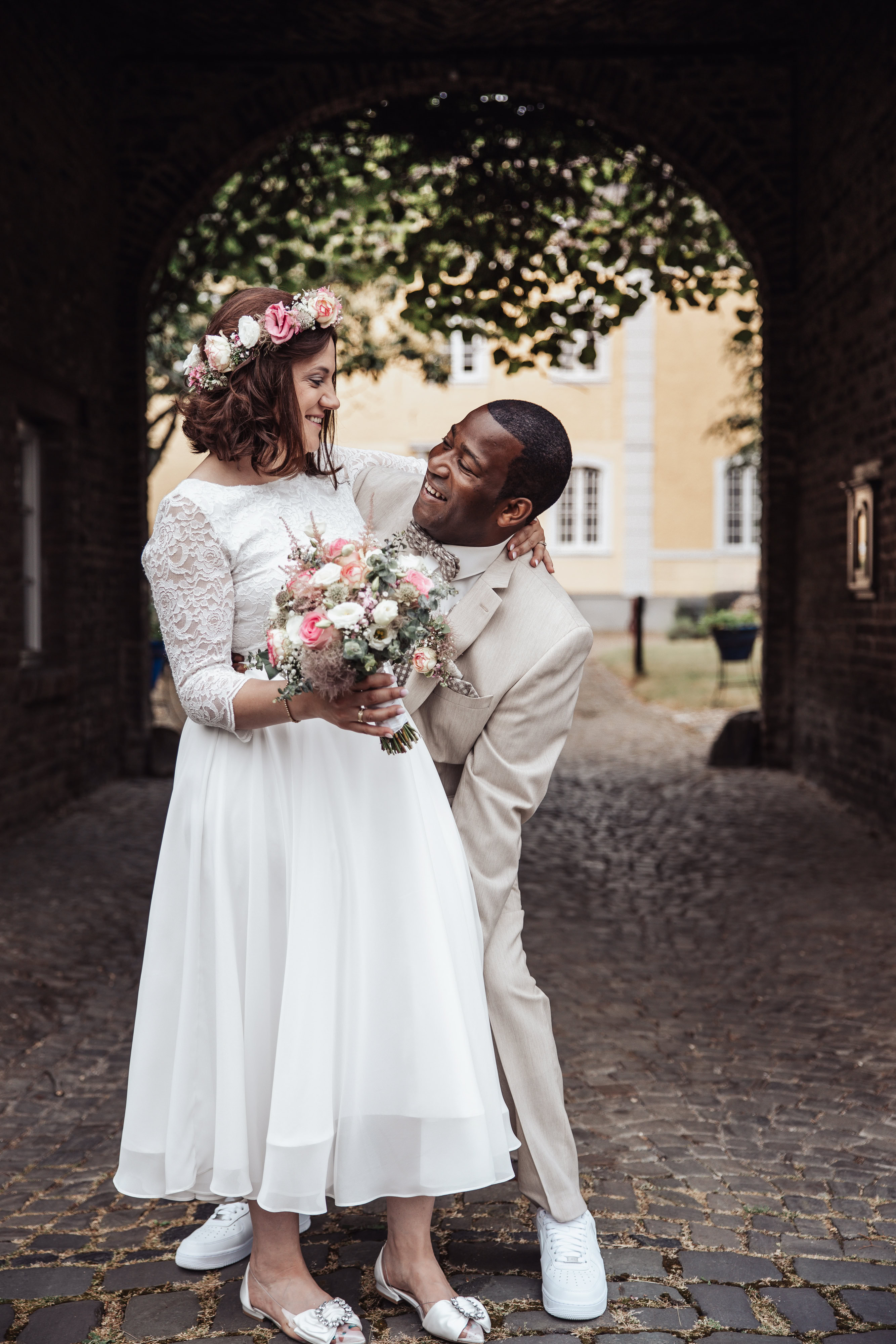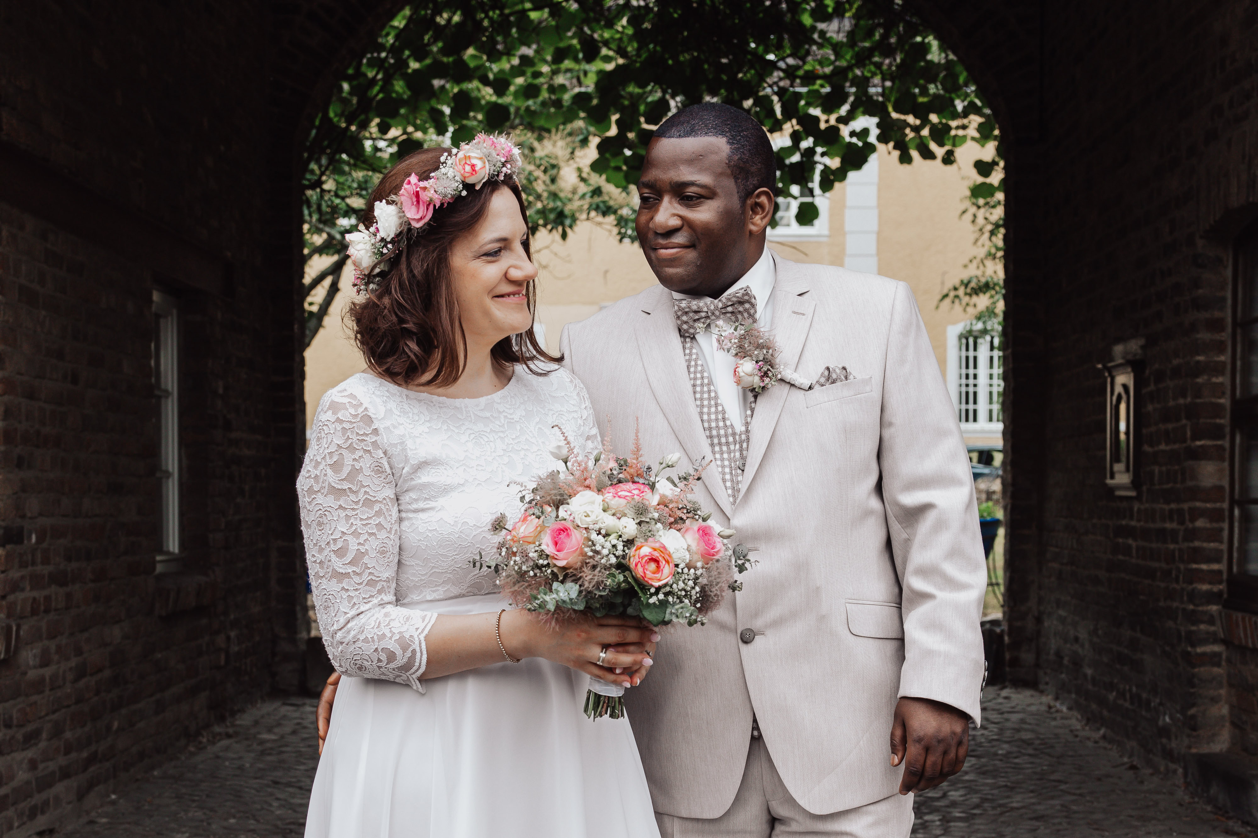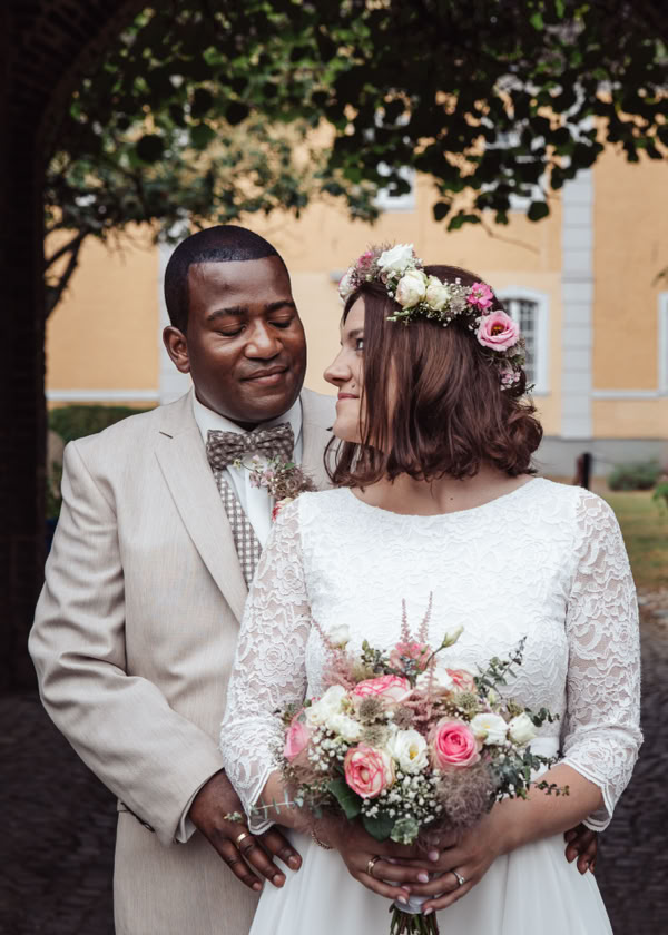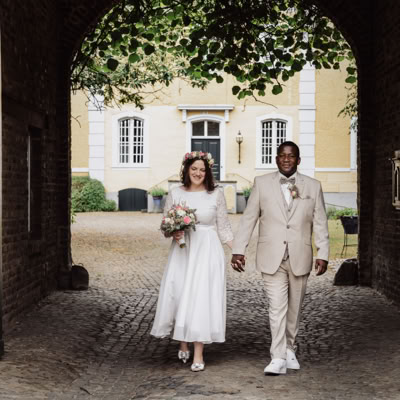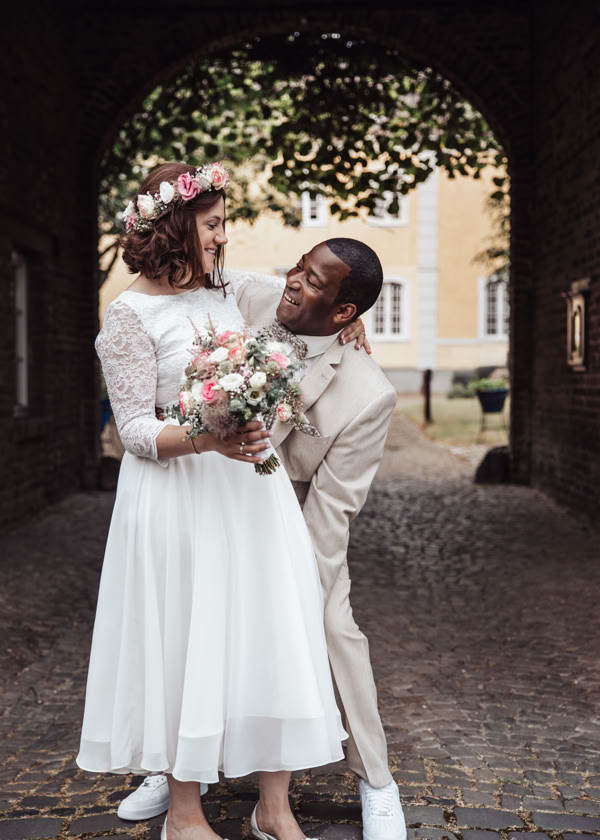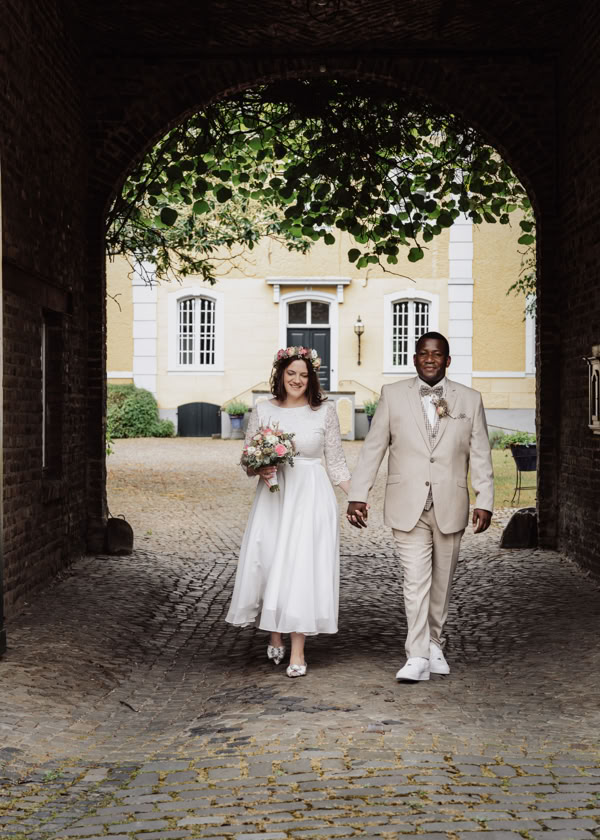 Nach der emotionalen Zeremonie begaben wir uns zum Brautpaarshooting in den historischen Ortskern Alt-Kaster, wo die romantische Kulisse dafür sorgte, dass Michele und Dombel trotz anfänglicher Schüchternheit vor der Kamera immer mehr auftauten. Mit sanften Anleitungen gelang es mir, ihre Natürlichkeit und innige Verbundenheit festzuhalten, was sich auch in den bezaubernden Fotos widerspiegelte.